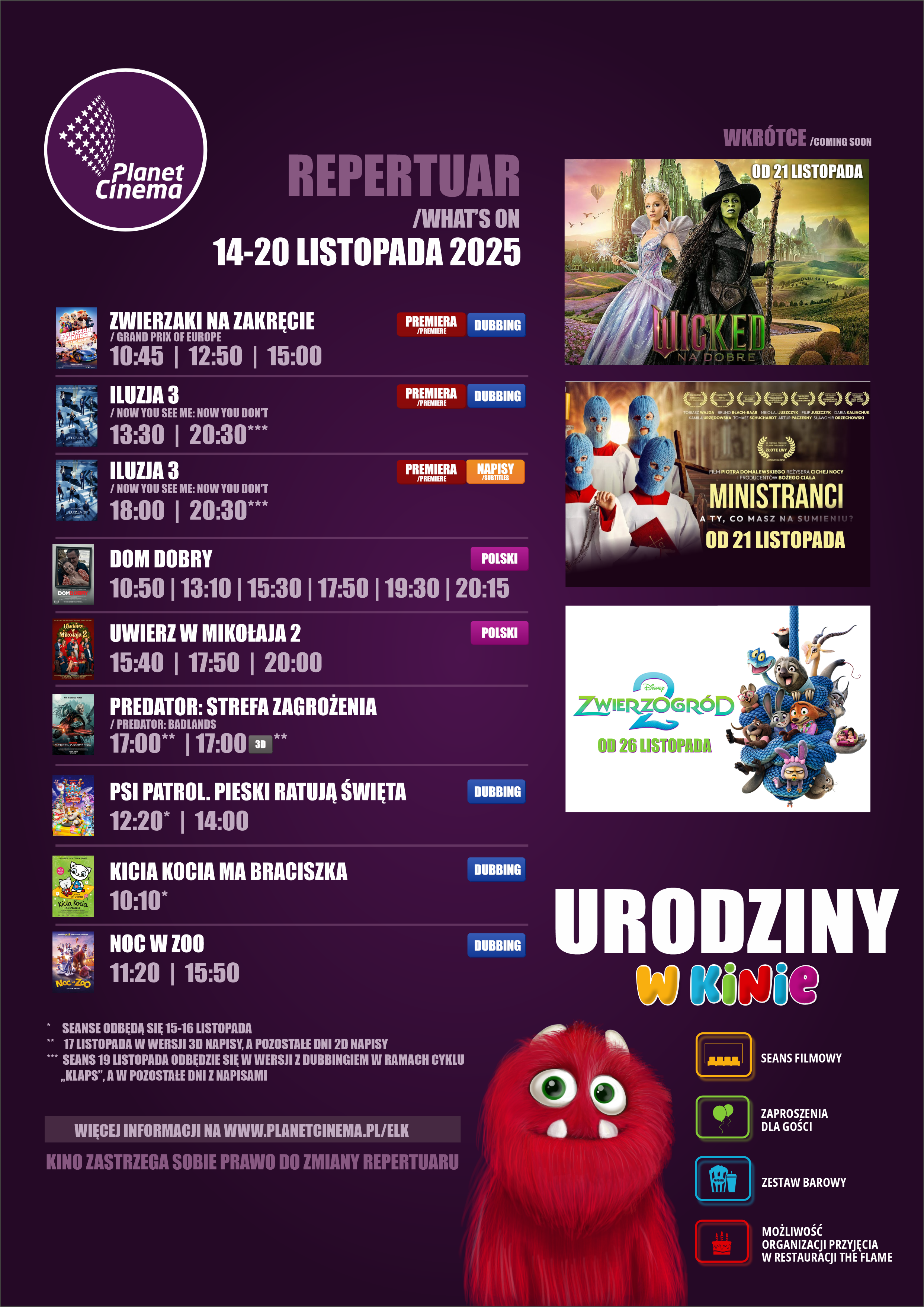 Zapraszamy do zapoznania się z repertuarem na nowy tydzień od 14 listopada:
