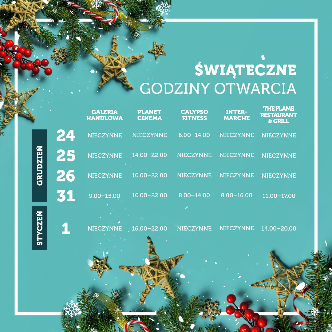 W okresie świąteczno-noworocznym Galeria Handlowa będzie funkcjonować w zmienionych godzinach. Wybrane lokale – m.in. Planet Cinema, The Flame Grill & Bar, Calypso Fitness czy Intermarché – również będą pracować według świątecznego harmonogramu.