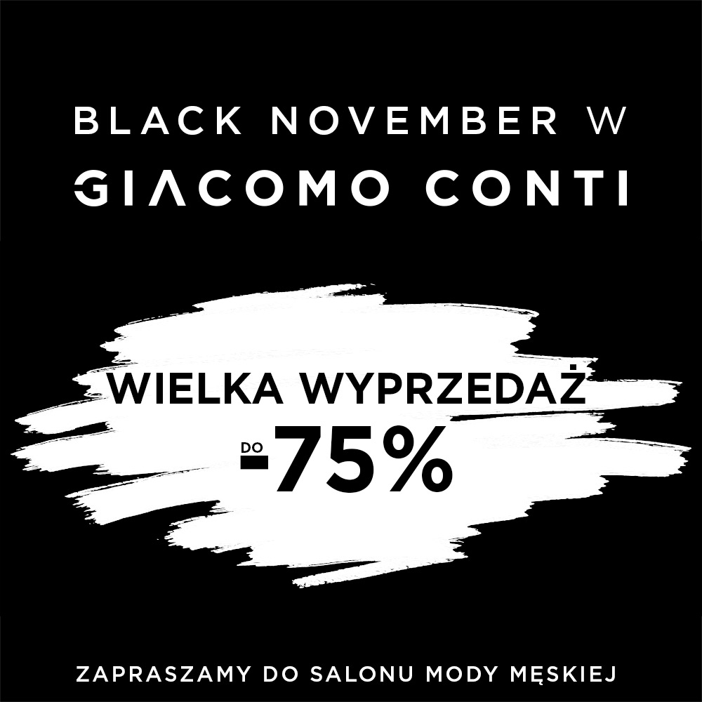 Świętuj z nami BLACK NOVEMBER! Już teraz w salonie mody męskiej Giacomo Conti WIELKIE rabaty! Druga sztuka za pół ceny i wiele produktów do -75% taniej! Nie czekaj, takie promocje zdążają się raz w roku. Zapraszamy do salonu mody męskiej Giacomo Conti.