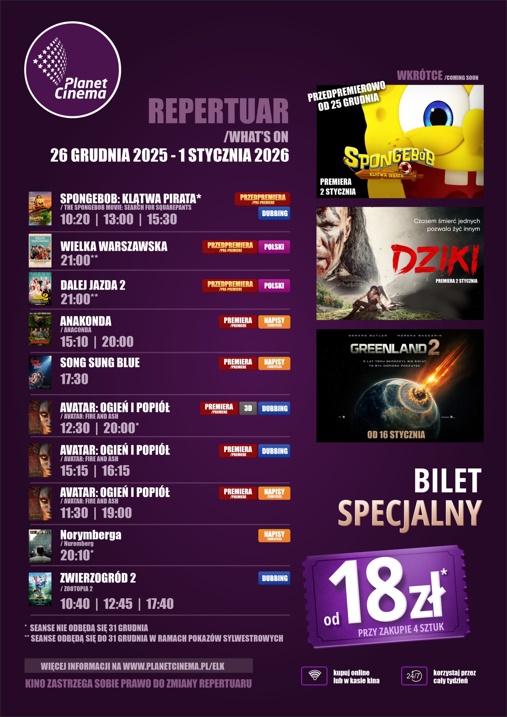 Zapraszamy do zapoznania się z repertuarem na nowy tydzień od 26 grudnia: