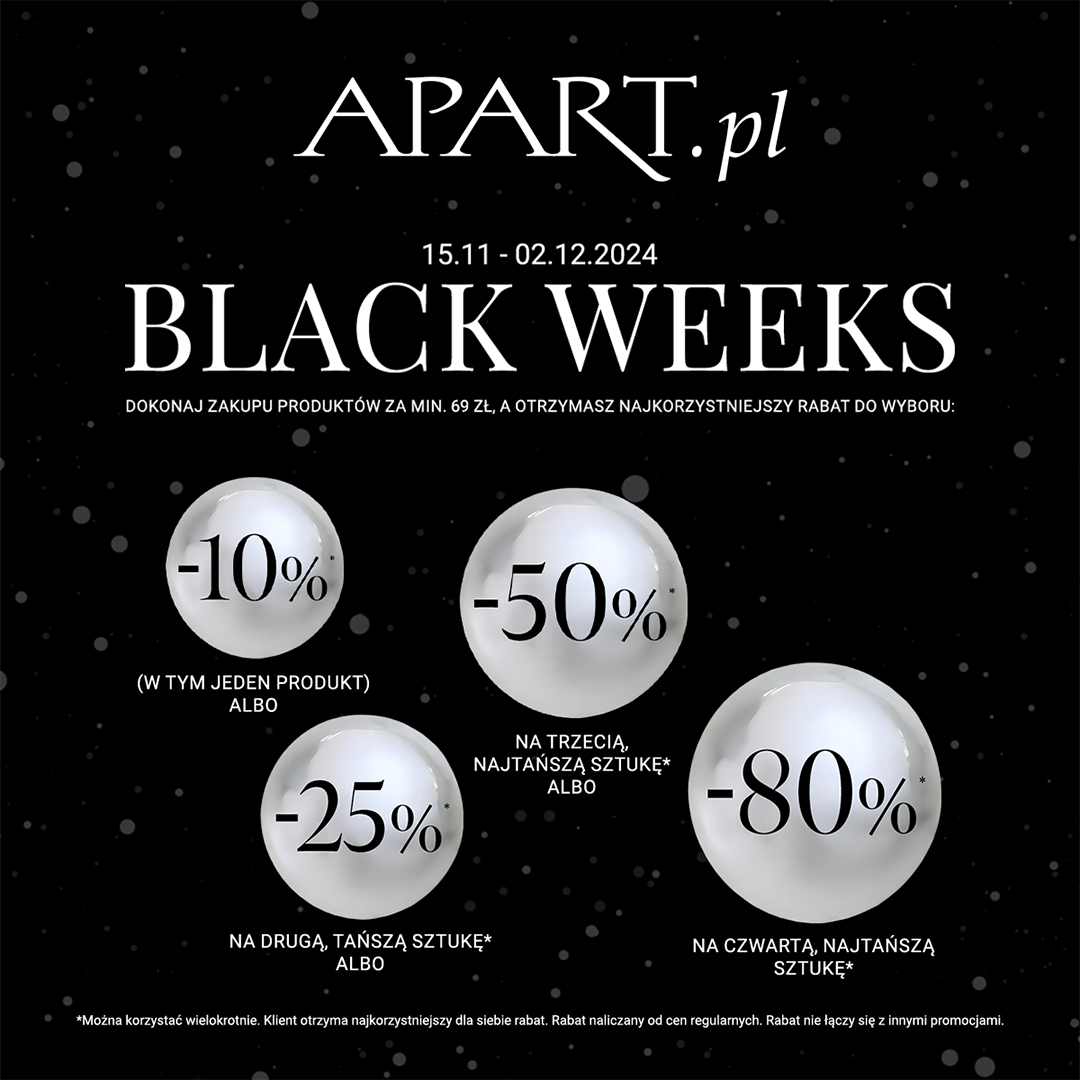 W dniach 15.11 – 02.12.2024 r. trwa akcja Black Weeks w Apart, w ramach której wystarczy dokonać zakupu za minimum 69 złotych, aby skorzystać z promocji. Rabaty wynoszą od 10% do 80% na najtańszy produkt przy zakupie czterech nieprzecenionych sztuk jednocześnie. Akcja Black Weeks obowiązuje na apart.pl oraz w salonach Apart i w czasie trwania promocji można dokonywać zakupów z rabatami wielokrotnie. Zobacz biżuterię z diamentami, złotą i srebrną, zegarki damskie i męskie oraz męskie i damskie smartwatche, a także produkty dla dzieci, w tym z nowych licencjonowanych kolekcji Harry Potter oraz Looney Tunes i kup prezenty świąteczne w czasie Black Weeks. Rabaty nie łączą się z innymi promocjami. Zapraszamy serdecznie!