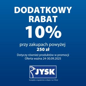 Parter, Lokal 0.1JYSK to jedna z najszybciej rozwijających się sieci handlowych na świecie sprzedających artykuły wyposażenia sypialni i mieszkania. Misją JYSK jest sprzedawanie artykułów dobrej jakości w niskiej cenie. W Europie JYSK jest jednym z najważniejszych sprzedawców artykułów do sypialni: kołder, poduszek i materaców, ale również wielu innych produktów kojarzonych z domem czy mieszkaniem - pościeli, ręczników, artykułów dekoracyjnych, mebli i mebli ogrodowych – projektowanych według prostych i minimalistycznych cech stylu skandynawskiego. Ambicją JYSK jest stać się liderem w sprzedaży artykułów wyposażenia sypialni i mieszkania. Początek sukcesu JYSK to 1979 rok, w którym to młody, przedsiębiorczy człowiek, Lars Larsen otworzył pierwszy sklep sprzedający między innymi pościel, kołdry, poduszki i łóżka. Pomysłem handlowym Larsa Larsena – skutecznym do dzisiaj – jest idea, aby zawsze dawać klientom dobrą ofertę. Z małej, lokalnej firmy, kierując się zasadami dobrego kupiectwa, Lars Larsen stworzył potężny ogólnoświatowy koncern. Sam zyskał uznanie jako biznesmen zostając przy tym jednym z najbogatszych ludzi w Skandynawii. JYSK ma ponad 2000 sklepów w 35 krajach.